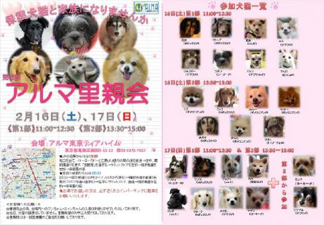 ■ティアハイムスポンサー様向け、オープンシェルター 2月9日(土)/10日(日)11時~15時 ティアハイムの運営をサポートしてくださっている「設立スポンサー」 「運営スポンサー(運営賛助会員)」の皆様にご訪問いただき、 現在の様子を見ていただきたいと思っています。 事前予約は必要ありません。 ※申し訳ありませんが、この2日間は、スポンサー様のみ、 ご来場を受付しております。 ■アルマ里親会 2月16日(土)/17日(日)11時~15時 ■一般向け、オープンシェルター 2月24日(日)11時~15時 どなたでもご来場可能です。