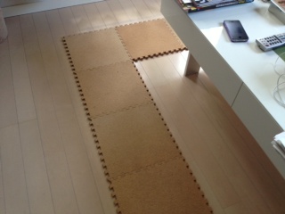 あわてて、家中の滑り止めになりそうなものをかき集め、あのようなパッチワークに(^^;・・・・・今日はコルクシートを増量しました。