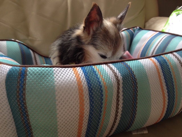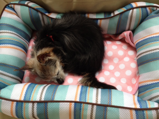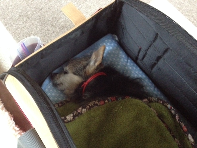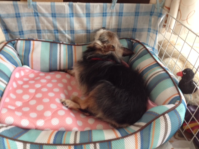 人の気配が消えると、不安になるのか起きだしてくるので、今日は家の中でリビングを離れた時は、カートに寝かせて一緒に移動しました(笑)