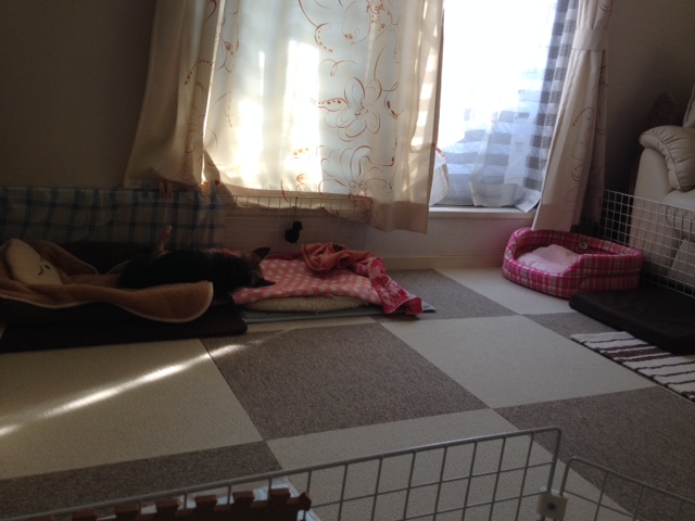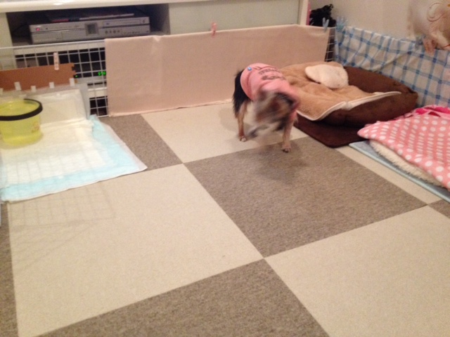 転ぶと、起き上がるのも難儀するので、トコたんスペースを広くしてタイルカーペットに変えました。