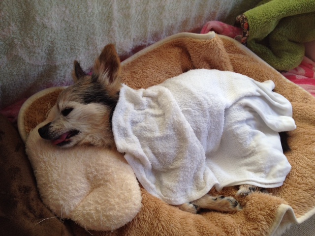 病院に行く前、興奮状態なので冷やしたらどうかと冷たいタオルをかけて、一時休止したトコたん。