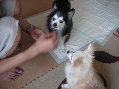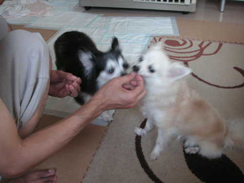 おやつ目当てで おじちゃんにむらがるワンズ。