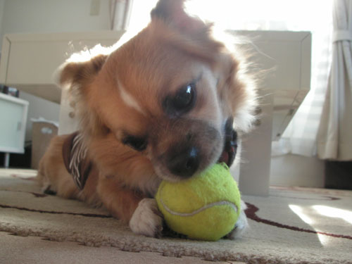 遊びにはあまり興味がないこてつも、何故かテニスボールは好きらしく、一生懸命がじってます。