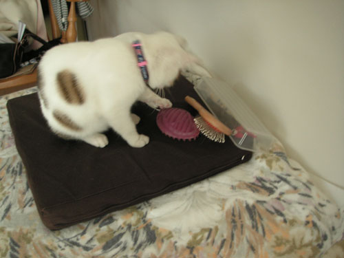と、アルトのお手入れをじっと見つめていたこの方、そばにあったブラシを自ら取り出しはじめました。