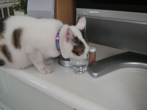 そして、しばらく遊んで飽きたのか、そばにあったお水をコウコク。