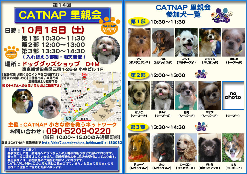 10月18日(土)CATNAPの里親会が開催されます。アルトは預かりの都合により参加できませんが、可愛いワンちゃん達がたくさん参加します。是非、会いにきてください!