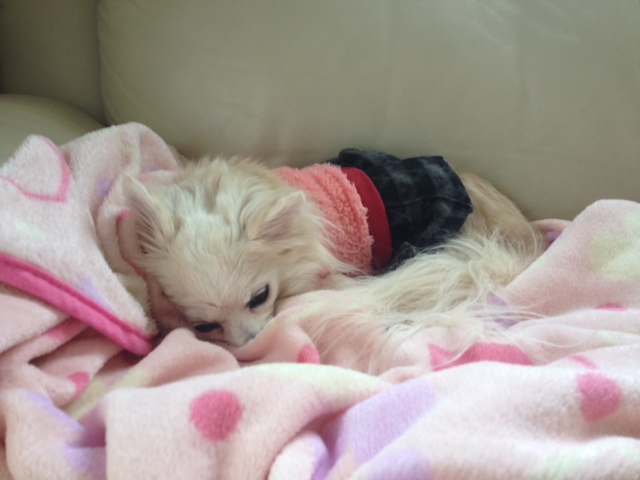 珍しく、たんぽぽちゃんも私の足にもたれてオヤスミナサイ・・・(お行儀悪くてすみませーん)