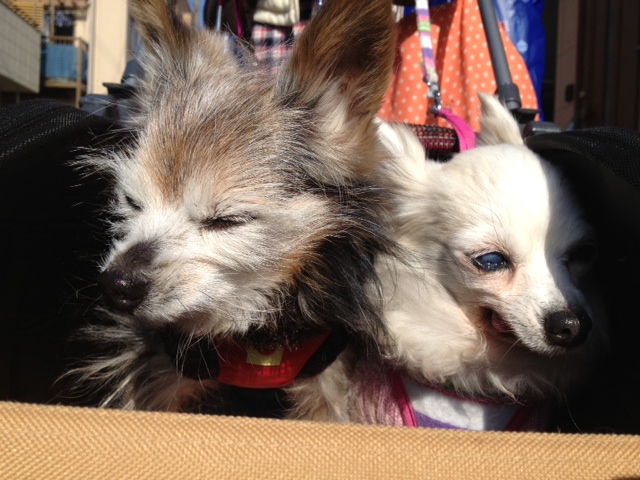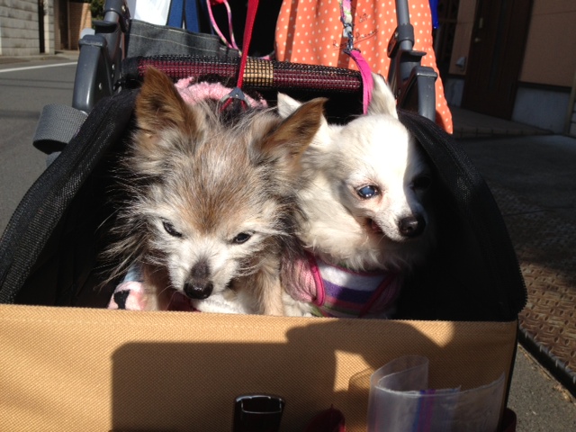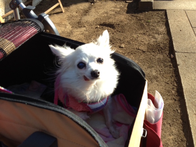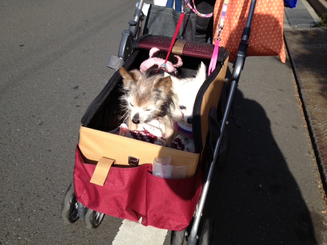 たんぽぽちゃん、本当は歩きたいのにカートに乗せられ不本意顔です。